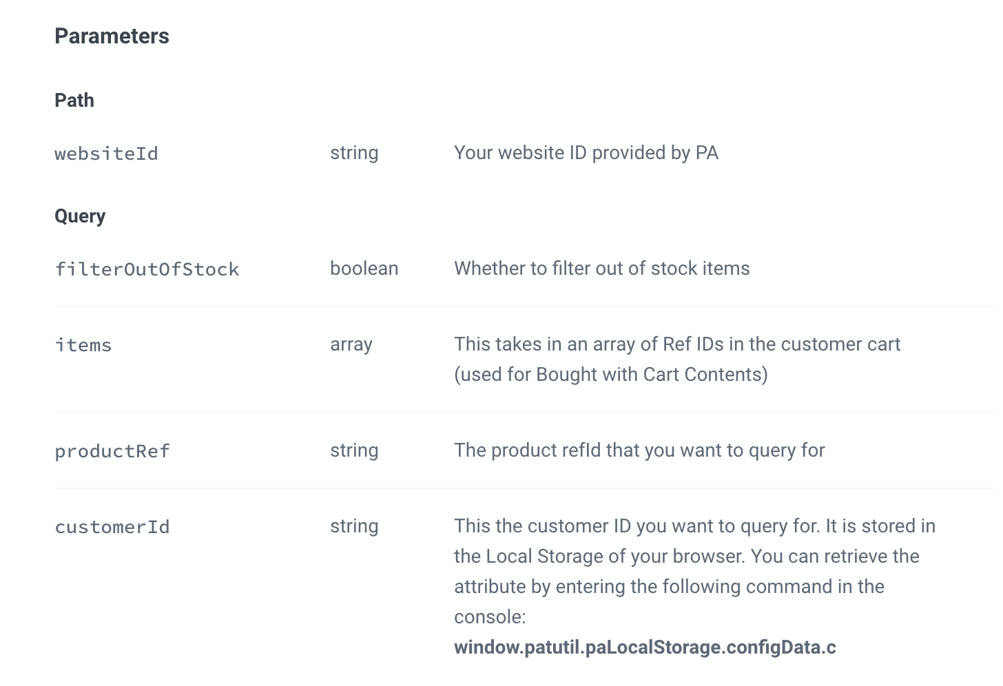 The PA Customer ID (PAC) is stored in the Local Storage of your browser. Retailers can retrieve the attribute by entering the following command in the console: window.patutil.paLocalStorage.configData.c