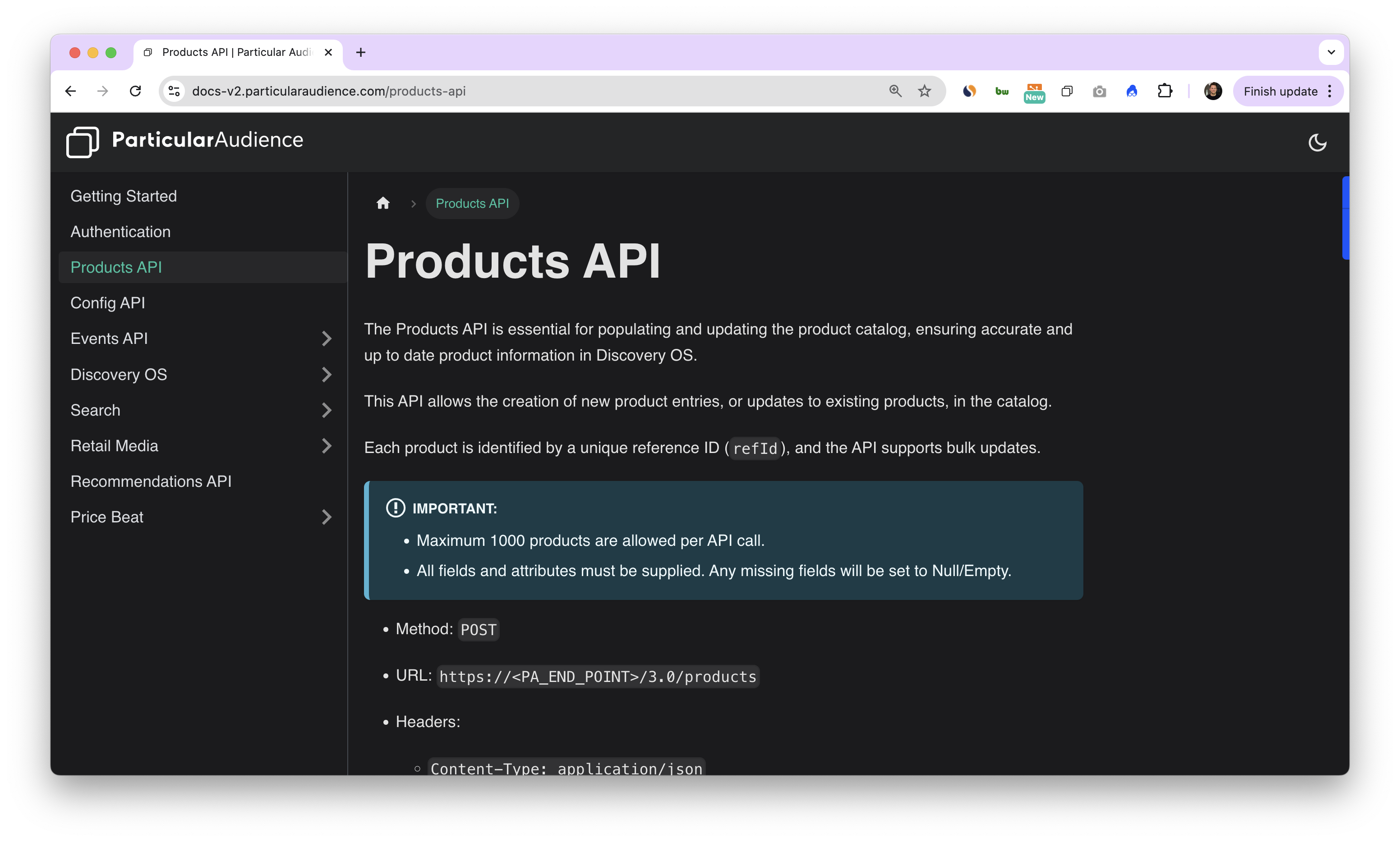 - Plug-and-Play E-Commerce Platform Integrations: Develop pre-built plugins for popular e-commerce platforms (e.g. Shopify, Magento). These connectors would automatically sync product catalogs via the Products API and inject PA’s recommendation widgets and search into the storefront with minimal setup. The PA APIs are designed to support any e-commerce platform or app (Search Overview | Particular Audience Docs), and pushing product data is made easy through a single API call (e.g. an UpdateProductDetails call from the store’s backend) (Search Overview | Particular Audience Docs).