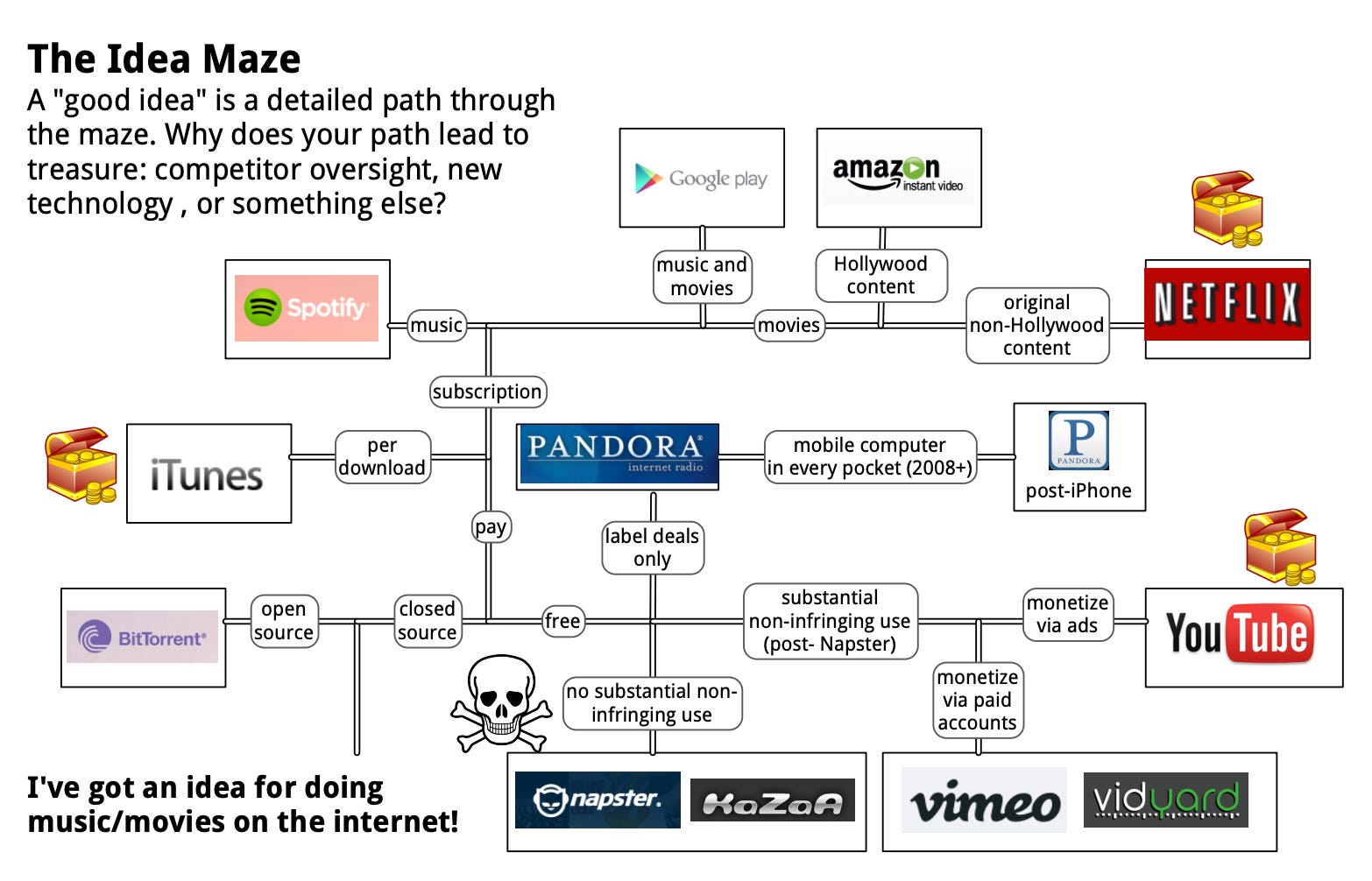 A good idea means a bird’s eye view of the idea maze, understanding all the permutations of the idea and the branching of the decision tree, gaming things out to the end of each scenario. Anyone can point out the entrance to the maze, but few can think through all the branches. If you can verbally and then graphically diagram a complex decision tree with many alternatives, explaining why your particular plan to navigate the maze is superior to the ten past companies that fell into pits and twenty current competitors lost in the maze, you'll have gone a long way to proving that you actually have a good idea that others did not and do not have.